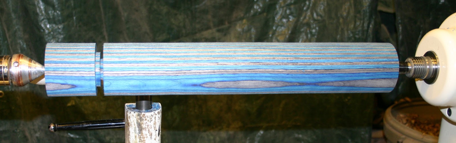 Here I have roughed the pepper mill to round between centers on my lathe. I have cut in for the head and will now take it to the band saw to cut off.