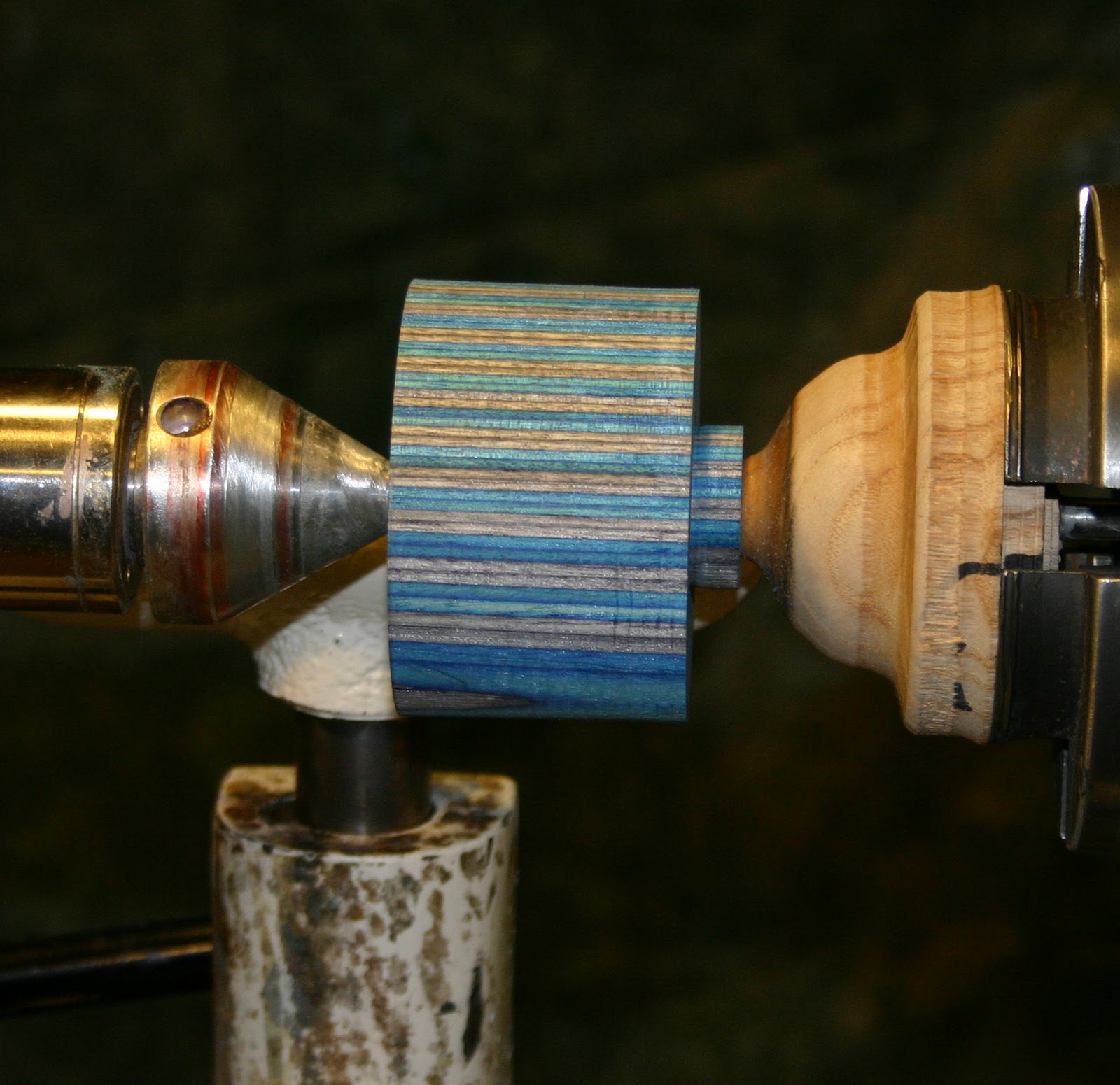 Here is the body being held between the tool above and the tailstock for the final turning to shape. At this time I will cut the shoulder down to meet the head and roll beads or rings onto the body (in this case 3 separate areas of beads/rings) and then turn the areas down to the final shape between the beaded areas. Everything will be sanded and then a finish will be applied all before it’s taken off from the lathe. Once it’s dry I will buff the head and body with 3 layers of wax, the last being carnuba wax. The last thing that I do is assemble the mechanism into the mill and it’s done.