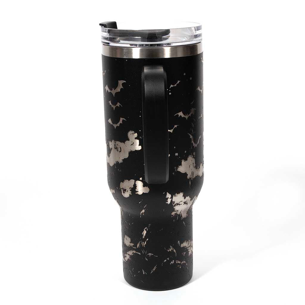 Halloween is coming right up and one of the images that pops to mind is that of a witch. For this tumbler she's dressed all in black and flying around on her broom. She is silhouetted by the moon while flying over a house and pumpkin patch.