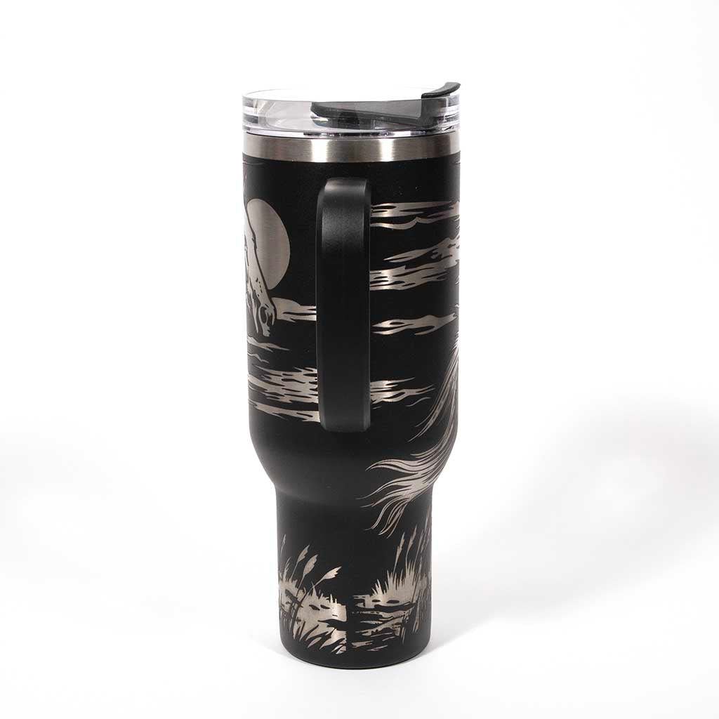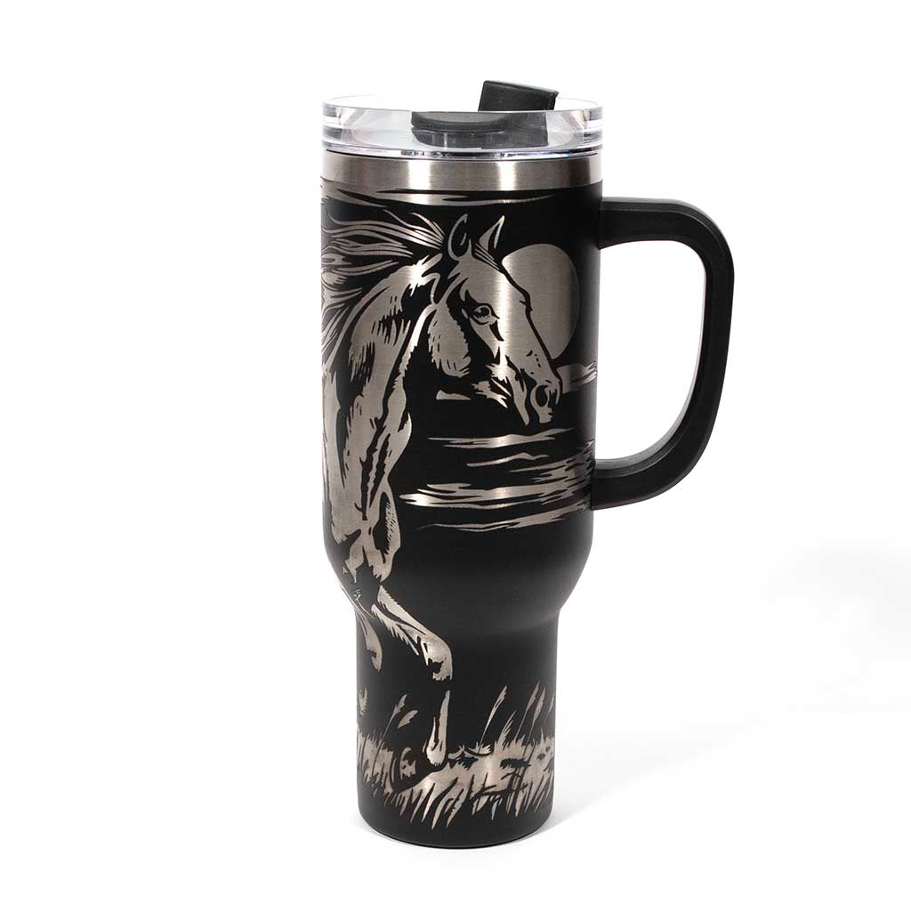 Are you someone who loves all things to do with horses? This black 40 ounce tumbler is for you! The tumbler has been engraved with one majestic horse running through the night. The engraving wraps most of the way around this tumbler.