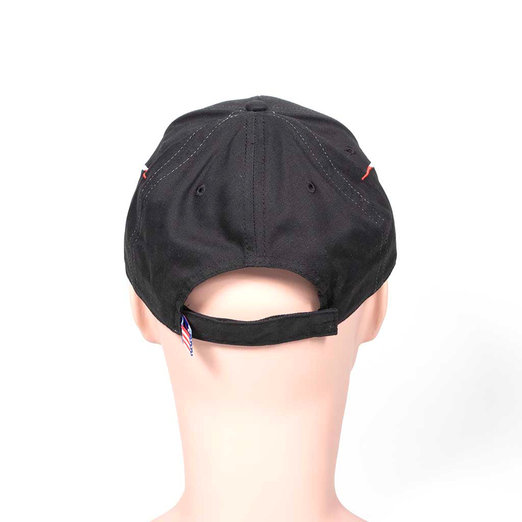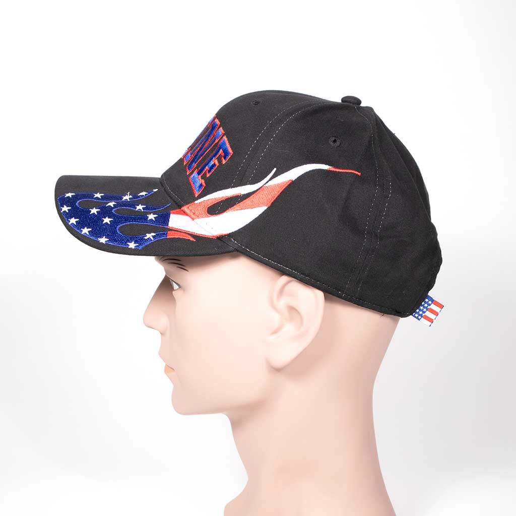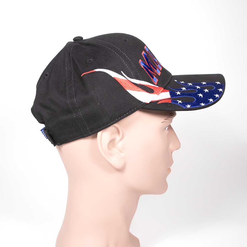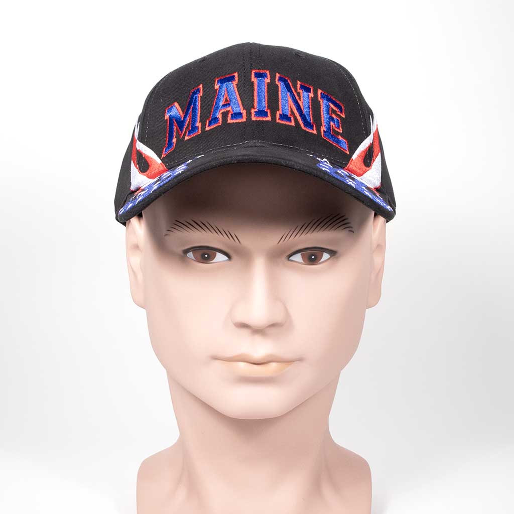 Show that Maine pride with this black cap with United States flag flames and Maine embroidered in blue with a red outline on the front. This is a beautiful patriotic Otto hat. The hat is a 6 panel hat with matching black undervisor. The hat also features an adjustable hook and loop closure.