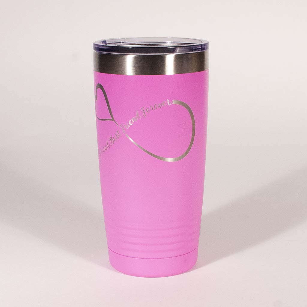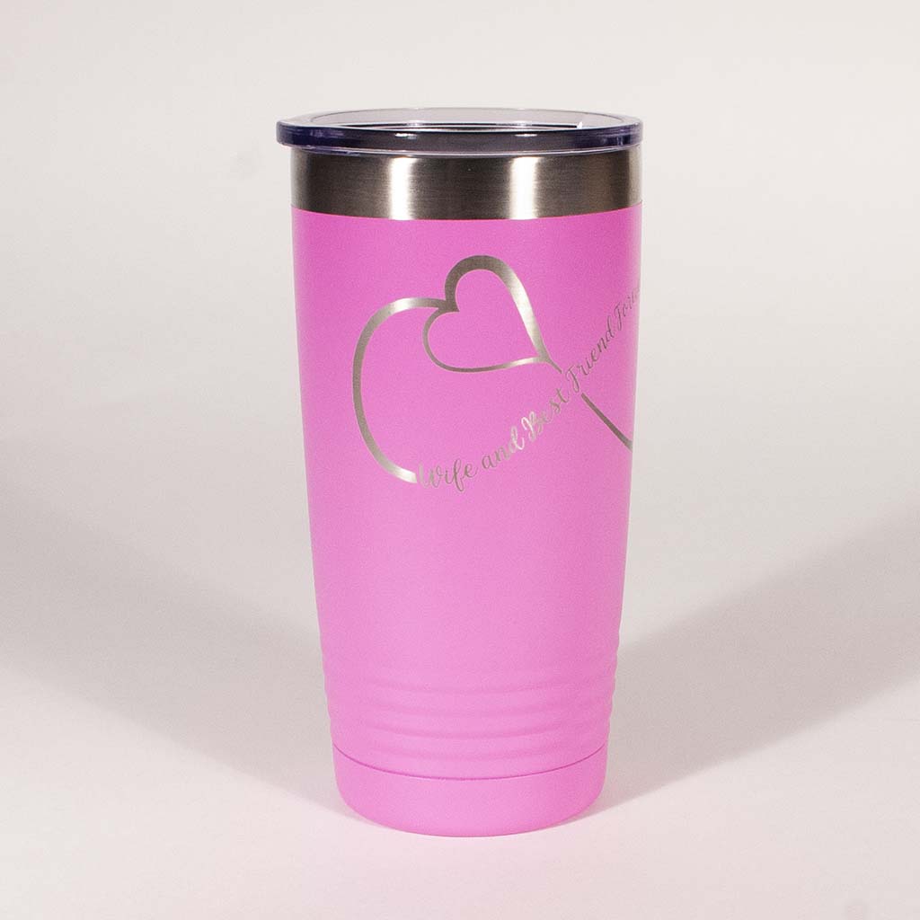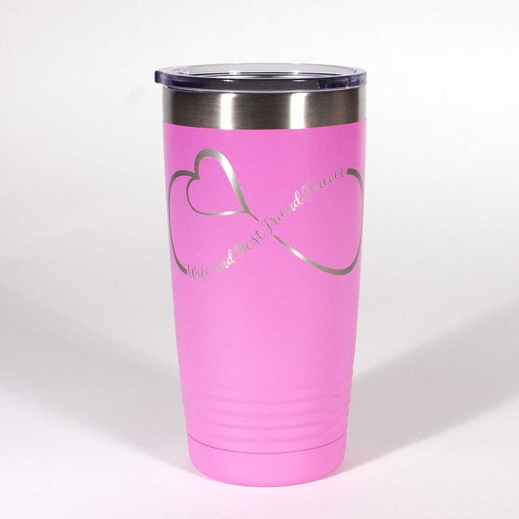 Let your spouse know how much you love them. All of the tumblers will be laser engraved with an infinity loop with a heart in the loop and the words "Wife and Best Friend Forever".
