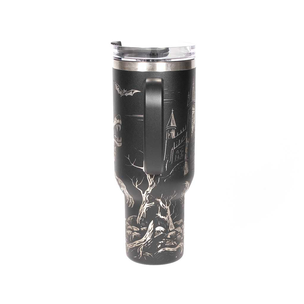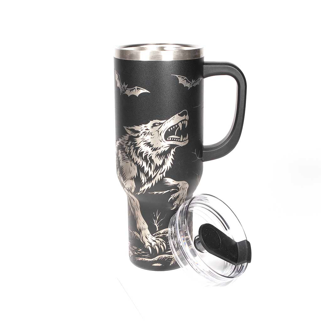This is a black 40 ounce powder coated tumbler with laser engraving of a Werewolf outside of a gothic cathedral, complete with bats flying around, all near a grisly old tree.